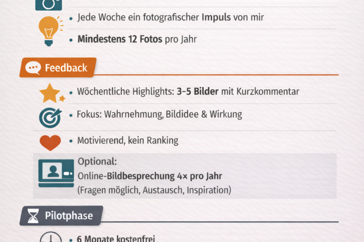 „Zwölf gute Fotos in einem Jahr sind eine gute Ausbeute.“ – Ansel Adams Genau darum geht es in meiner neuen wöchentlichen Foto-Challenge „12 aus 52“ : dranzubleiben, bewusster zu fotografieren und sich über Impulse und Austausch weiterzuentwickeln – ohne Leistungsdruck, aber mit Verbindlichkeit. Das Angebot richtet sich an für ehemalige und zukünftige Fotokurs- und Fotoreisenteilnehmende. 📸 So…Mehr erfahren→